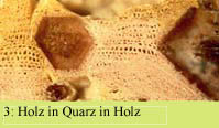 3: Quarzkristalle, in erweichtem Holz gewachsen, mit eingeschlossenen